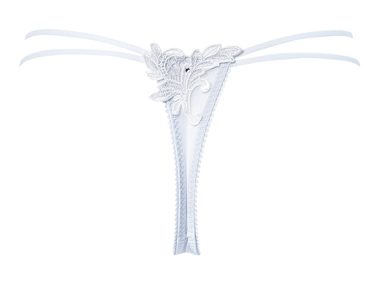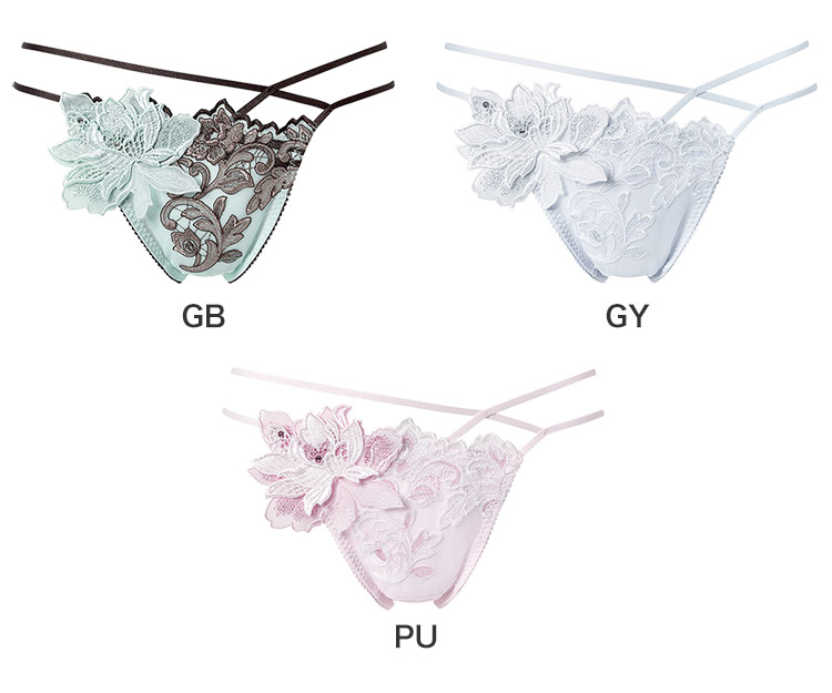 古代ギリシアの建築にインスパイアされたデザインのレースと、アカンサス文様をあしらったバラのアップリケがラグジュアリー。花びらにはキラキラと輝くスワロフスキー・クリスタルを飾りました。左右のストラップにほどこされた2枚の羽根モチーフがアクセント。あえてシンプルなカラーリングにすることで洗練された美しさを表現しました。ディテールにこだわった特別感のあるシリーズ。