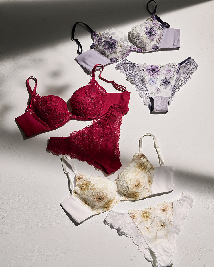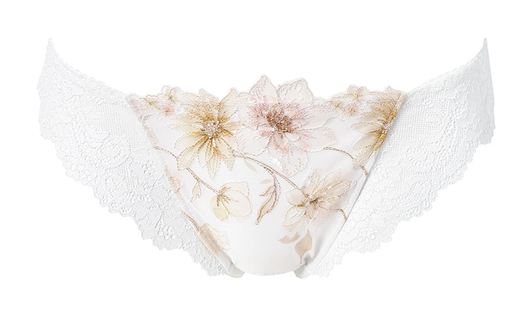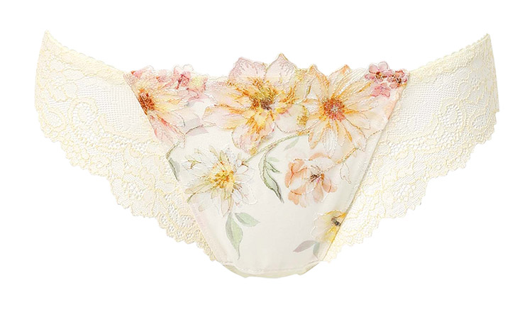 「ハグするブラ(BXB478)」「ハグするブラ コンパクトメイク(BXB378)」とペアコーデが楽しめるTバックショーツ。バックは総レースタイプでひびきにくく、華奢なフォルムでありながらヒップをほどよく覆う安心感のあるはきごこちが人気のデザインです。とろみのあるスカートやタイトなボトムもきれいに着こなせます。表情豊かな花々が咲くフラワーガーデンをイメージしたレースをフロントにあしらったスウィートなデザインです。