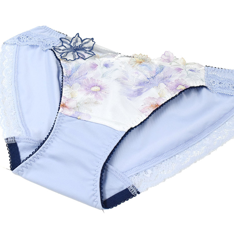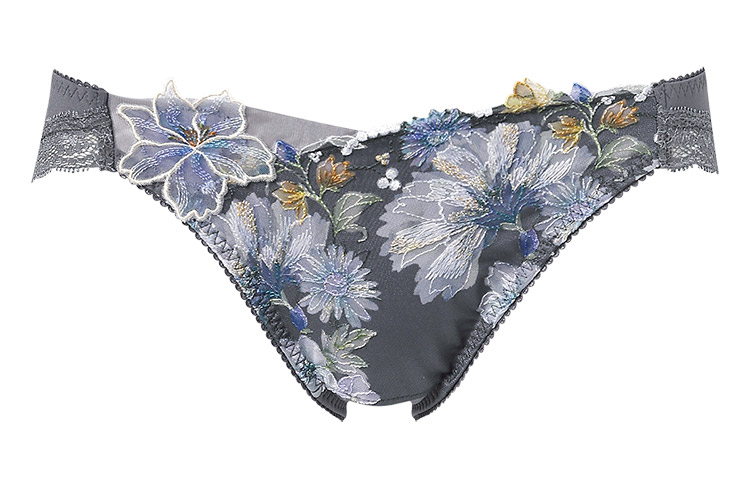 フロントのレースには繊細に輝くラメ糸を散りばめ、華やかなアップリケをワンポイントにあしらった優雅で贅沢なショーツ。M・Lサイズはフロントサイドに、LL・3Lサイズはフロント上辺に透け感のあるチュールを用いて、軽やかなデザインに仕上げました。あさめのはきこみ丈で甘すぎずすっきりとした印象に。