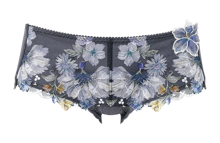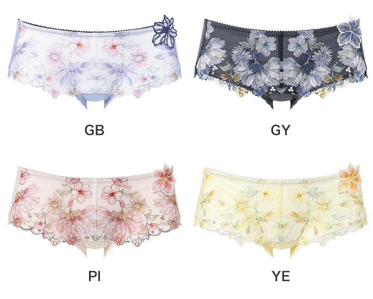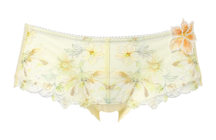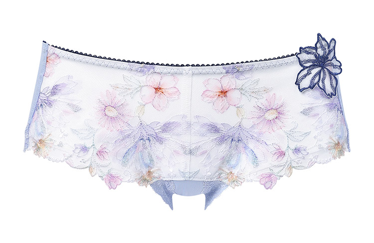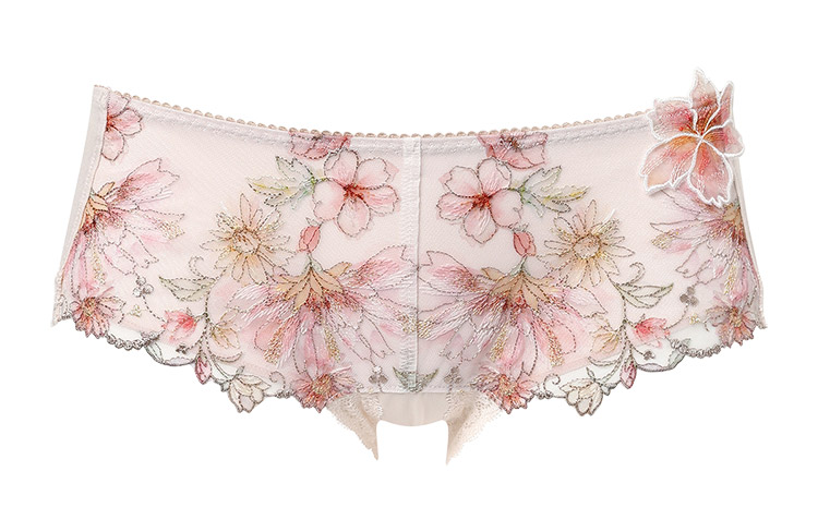 フロントのレースには繊細に輝くラメ糸を散りばめ、華やかなアップリケをワンポイントにあしらった優雅で贅沢なショーツ。M・Lサイズはフロントサイドに、LL・3Lサイズはフロント上辺に透け感のあるチュールを用いて、軽やかなデザインに仕上げました。あさめのはきこみ丈で甘すぎずすっきりとした印象に。