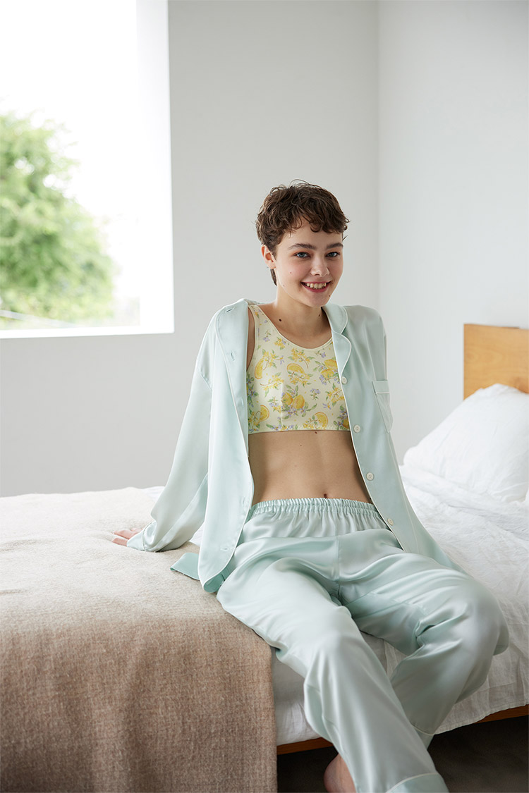 ・袖と身頃のハギ位置をずらしたパターン設計で、肩と腕のラインに自然に沿って着ごこちがよい