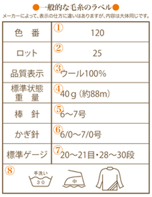 毛糸の基本情報は、それぞれの毛糸の「ラベル」から読み取ります。