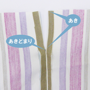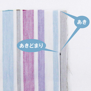 「あき」は、2枚の布を縫い合わせる際、縫わずに残しておく部分(巾着のひも通しや、ファスナー付け、スリット作りなどに必要)のこと。