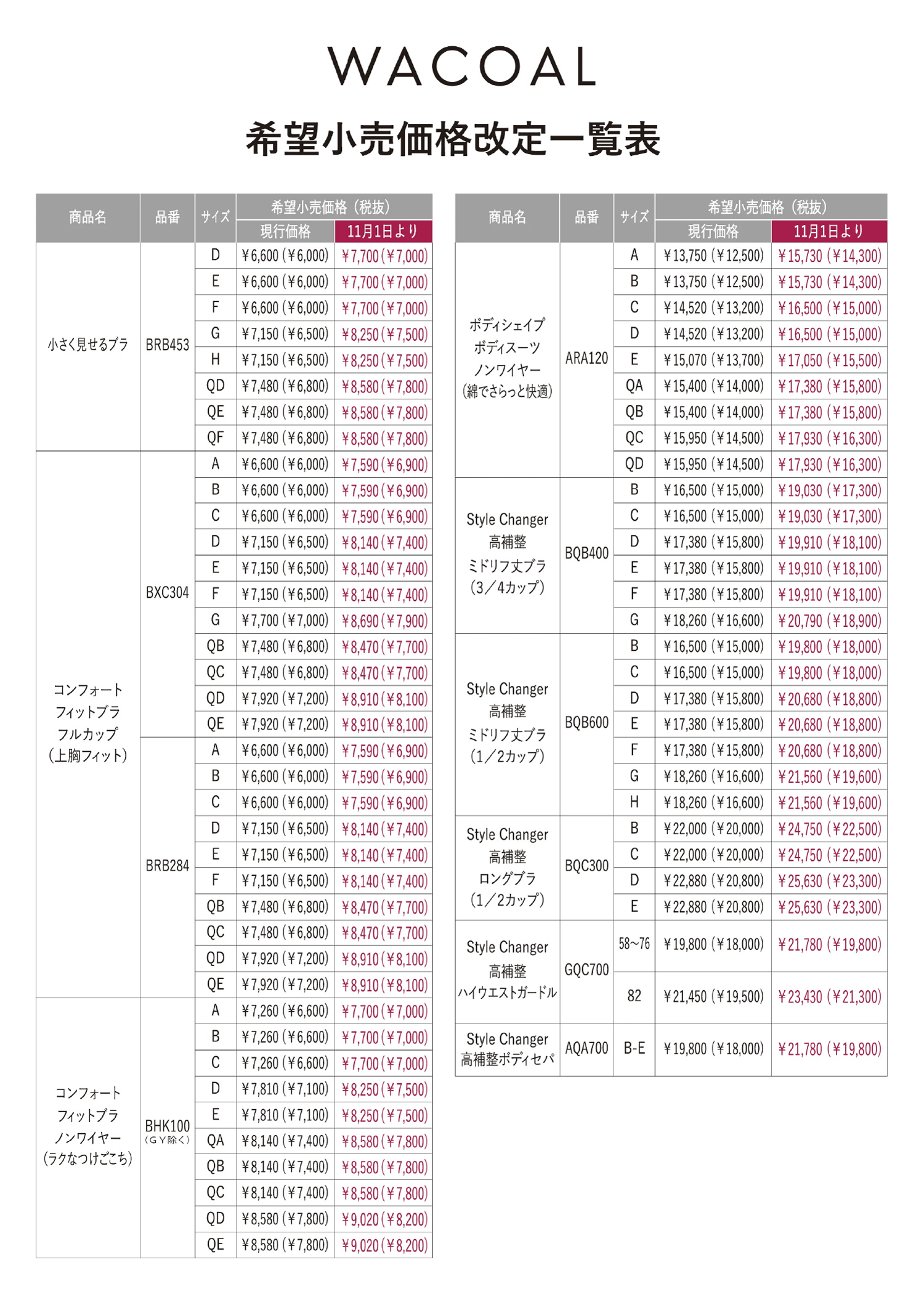 この度、原材料の高騰等により、ワコールブランドにおける一部の商品につきまして
